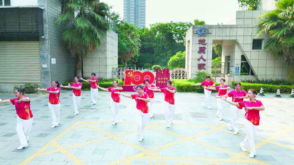 196地质大队退休老同志舞蹈队在练习广场舞,为庆祝建党100周年做准备。