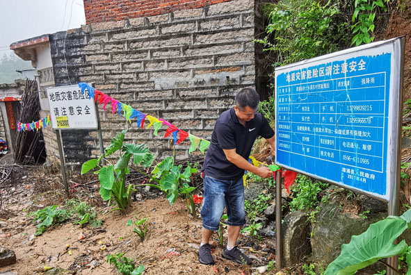 漳州市自然资源局派出11个督促指导组,深入全市16个县(市、区)、开发区,指导地灾防御工作,并按照有关要求,对村、居受灾点人员转移安置情况进行检查。图为该局工作人员在地灾危险区拉警戒线。