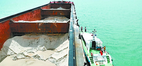 9月16日,福鼎市自然资源局协调组织海事局、海洋与渔业局,在沙埕至嵛山岛海域开展打击非法盗采海砂海上联合执法行动,共出动执法力量20余人,执法船1艘,查处违法运砂船舶2艘,查扣非法盗采的海砂3000余吨。图为打击非法盗采海砂执法现场。