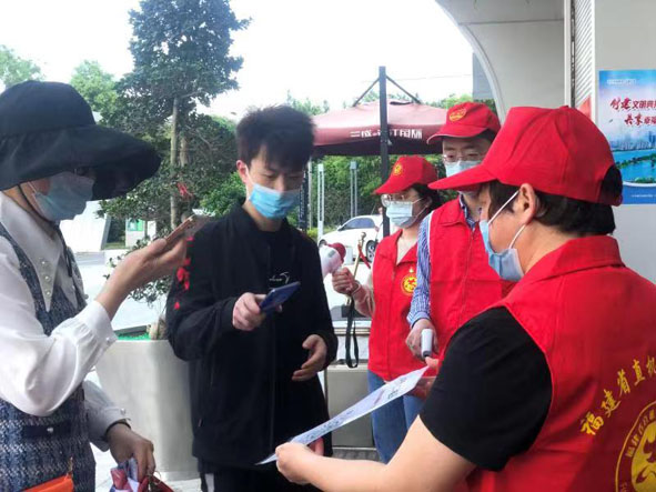 4月12日,省国土资源档案馆党支部组织党员志愿者,到仓山区港头社区开展疫情防控志愿服务活动,助力社区开展“无疫小区”创建活动。 图为志愿者对出入小区人员进行健康码和行程码核验。 ■ 林月娥