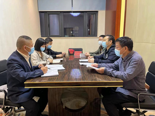 图为许建忠(左一)与同事们进行工作交流。