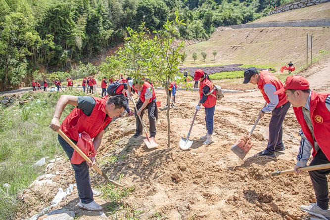 5月17日,省测绘地理信息发展中心组织志愿者到罗源县白塔乡百丈村开展“绿色家园,助力乡村振兴”义务植树活动,为生态百丈建设增添新绿。图为该中心志愿者在规划好的山上林地栽植树苗。 ■ 张仲增