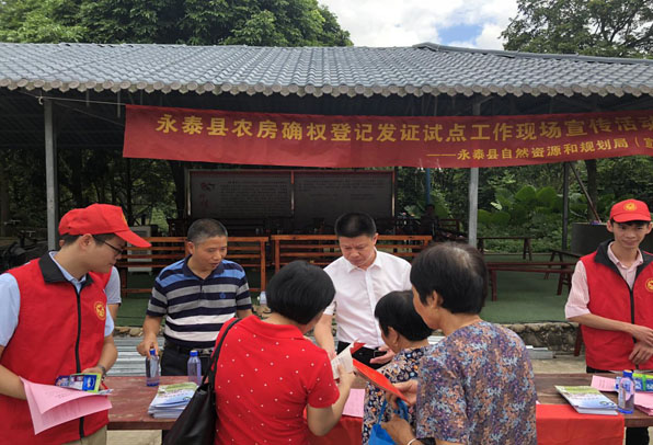 6月10日,永泰县自然资源和规划局会同梧桐镇政府到该镇坵演村开展农村宅基地和房屋确权登记现场宣传活动,并为自愿申请并符合登记条件的31户农户颁发不动产权证书。至此,该县农村宅基地和房屋确权登记发证试点工作圆满完成。图为该局工作人员向群众分发宣传资料,并解答疑问。