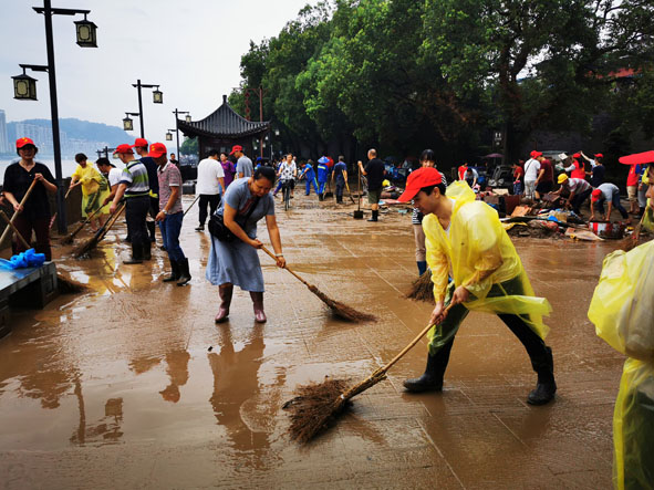 连日来,邵武市遭暴雨侵袭,全市不同程度受灾。7月10日,大水褪去,邵武市自然资源局组织机关干部职工,组建志愿服务队前往受灾严重的北门社区和五一九社区开展灾后清理工作。图为该局志愿者在北门社区帮助清理路面淤泥。