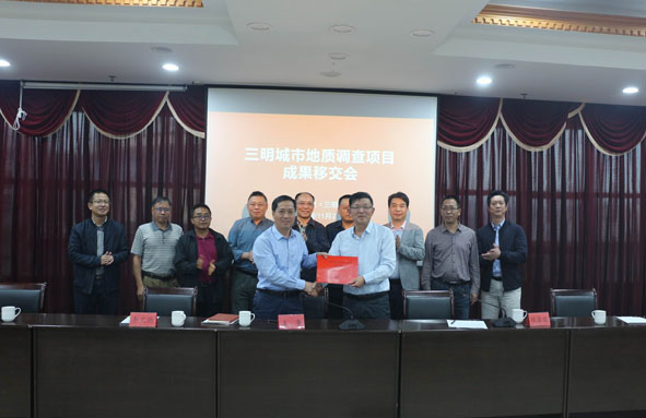 11月25日,三明市自然资源局举办三明城市地质调查项目成果移交会。会上,省煤田地质局副局长、总工程师陈泉霖(前右)介绍了项目在工程地质、水文地质、水土环境等方面取得的主要成果及移交的主要内容。三明市政府副秘书长王争(前左)对项目成果进给予充分肯定,对省煤田地质局及项目组长期以来的辛勤付出表示衷心的感谢。 图为项目成果移交现场。