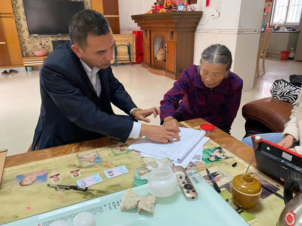 日前,东山县不动产登记中心正式推出不动产登记微信预约服务,服务对象可通过关注该中心微信公众号,进行不动产登记预约排号,行动不便的老、弱、病、残、孕等特殊群体还可预约上门服务。 图为近日,该中心工作人员按照网上预约上门服务要求,到陈城镇白埕村为行动不便的老人办理不动产登记相关手续。