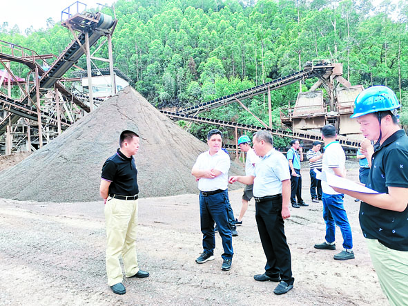 8月2日,永泰县副县长余斌(左一)带领自然资源和规划局工作人员先后检查了4家涉矿企业及砂石转运点,要求进一步强化安全责任,做好汛期的各项安全生产工作。图为余斌一行在砂石转运点现场进行工作检查。 ■ 施亚鑫 王梦潭