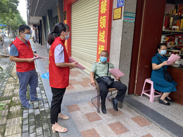 图为该局党员志愿者走家入户分发疫情防控《倡议书》。