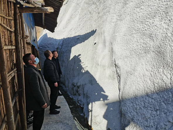 3月11日,柘荣县自然资源局工作人员会同技术支撑单位技术人员,对柘荣县宅中乡山樟村地灾治理工程施工情况和富溪镇地灾防治工作进行汛前检查。 图为工作人员在一居民屋后查看高陡边坡稳定性情况。