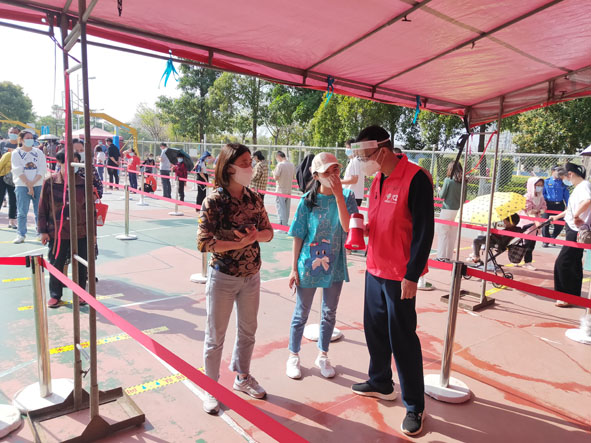 图为该所党员志愿者正在引导群众排队做核酸检测。