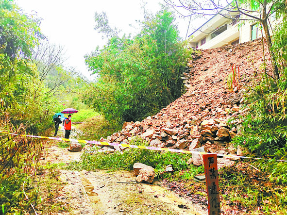 3月26日,永泰县富泉乡德洋村得石夹港溪3号倪兆金屋前边坡发生滑坡,省煤田地质勘查院受委托派出专业技术人员到达现场,开展地质灾害应急排查工作,对地灾性质、规模、发生原因进行调查,为当地政府提供决策依据。 图为调查现场。