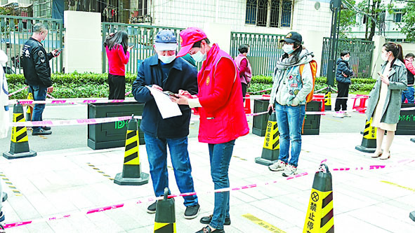 图为该局志愿者在采样点协助居民进行核酸检测预登记,解答居民疑问,维护现场秩序。