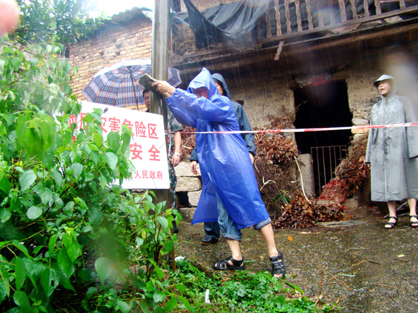 从8月6日起,莆田市国土资源局城厢分局对全区74个地灾隐患点及14个高陡边坡、河口沟谷、矿山等危险区域逐一排查、踏勘转移路线和安置避灾场所;挂钩领导及股室负责人全部驻村指导防灾工作。图为城厢分局领导深入地灾隐患点检查地灾警示牌安放情况。 ■ 方 琳