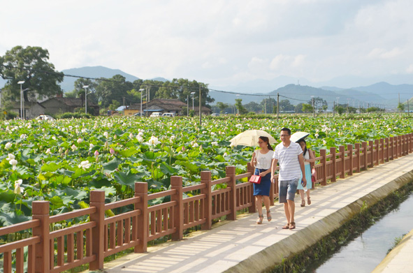 日前,光泽县鸾凤乡上屯村利用土地整理的高标准农田种植的150亩连片荷花竞相开放,吸引了众多游人驻足观赏。上屯村是光泽县第一批美丽乡村建设省级试点村,该村充分利用高标准农田鼓励和引导农民种植荷花,并以观光、采莲、餐饮等一体发展农家乐,既美化了乡村又带动了一批村民致富。■ 李福根 魏静雯