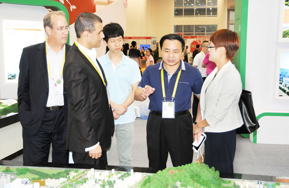 龙岩市国土资源局抓住土地和商品住宅市场逐渐回暖,销售持续增长,且房价呈现“量升价稳”的良好局面,通过土地推介会等方式,吸引有规模、有实力的客商前来投资。图为国外客商在今年“9·8”第七届中国地交会龙岩展厅听取龙岩市国土资源局局长冯添桂有关土地推介。 ■ 吕洪荣