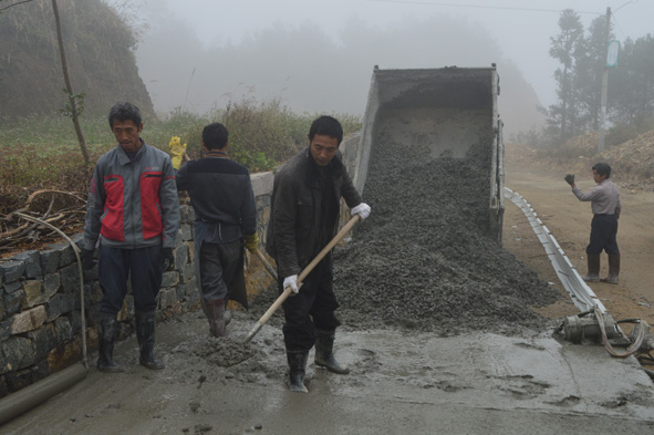 莆田市国土资源局积极实施精准扶贫,今年投入40多万元资金,重点支持挂钩扶贫村——涵江区新县镇白云村的基础设施建设。图为12月15日,白云村村道硬化工程正在加紧施工中。  ■ 张步雄