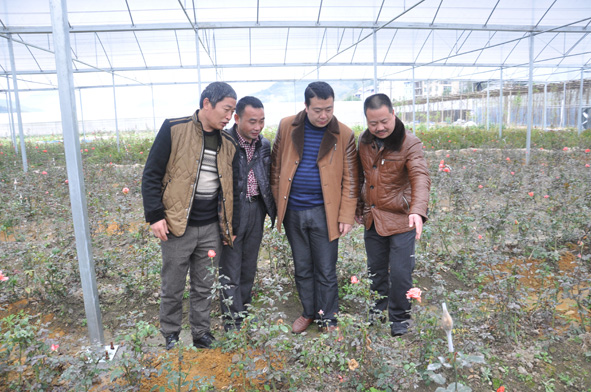 政和县铁山镇东涧村在南平市各级国土资源部门的帮助下,通过土地整理、流转,引进千亩大棚花卉基地项目落户,采取“公司+村集体+农户”的模式,带动90户农户共同经营,每年为当地群众增收500余万元,实现土地集约经营增收。图为1月20日,政和县国土资源局副局长叶性旺(右一)到东涧村土地整理项目区,了解大棚花卉基地种植情况。 ■ 本报记者 陈龚清