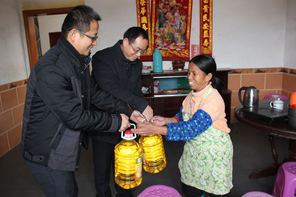日前,省196地质大队副队长刘建安等一行深入该队驻村干部蹲点地——上杭县南阳镇豪东村,走访慰问13户贫困家庭,为他们送上慰问品、慰问金及节日祝福。■ 陈丽娟