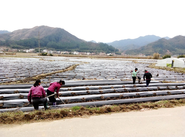 “十二五”期间,在连城县国土资源局的大力支持下,该县姑田镇积极实施土地整理项目,截至2015年底,共整理耕地1900多亩。整理后的耕地,连年被农业大户租赁发展高效农业,实现了降本增效。 图为2月25日,姑田镇下堡村村民在土地整理项目区整理烤烟种植畦。 ■ 周宗胜