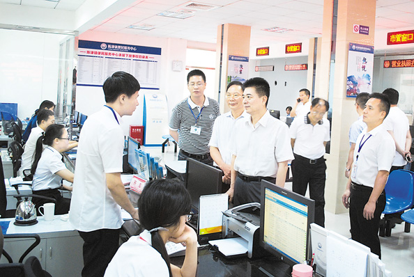 9月8日,省国土资源厅党组书记董建洲带领机关有关处室负责人到泉州调研,听取泉州市国土资源工作汇报,深入晋江市国土资源局陈埭分局、泉州市行政服务中心国土资源窗口、市不动产登记局和不动产登记中心等了解服务群众窗口建设情况,并就贯彻《国家生态文明试验区(福建)实施方案》、提升服务保障能力、夯实基层基础等工作提出要求。图为董建洲一行在晋江市国土资源局陈埭分局了解基层队伍建设情况。