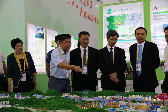 图为参展期间,南平市委书记庄稼汉(右二),市委副书记、代市长许维泽(右一)、副市长廖俊波(右三)、市国土资源局局长陈钟珏(左一)等察看延平城区城市规划展示沙盘。 ■ 张信辉