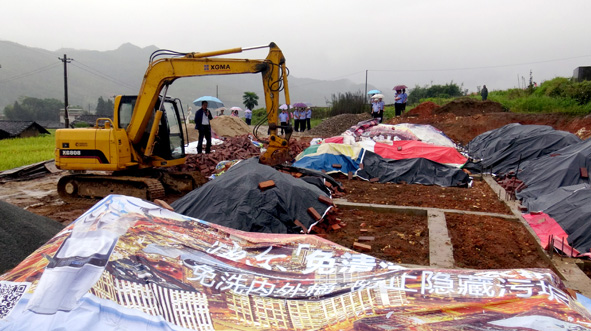 长汀县宣城乡畲心村2户村民在未取得任何手续的情况下,在基本农田保护区内顶风抢建。在多次劝说、制止无效的情况下,9月30日,长汀县国土资源执法监察大队依法强制拆除了这两处违法建筑。图为拆除违建现场。 ■ 肖贵辉