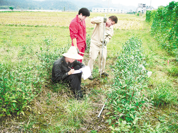 “武夷山市茶产地土地质量及生态地质环境调查”项目是省121地质大队承接的首个农业地质调查项目,并于10月29日通过了省国土资源厅组织的专家组验收。该项目组通过开展野外调查、样品分析测试及各种原始资料系统整理、综合分析研究,较好地完成了武夷山市茶园土壤的环境质量调查和评价,为控制污染、保护农业资源和环境、培育有机茶园提供了科学参考。图为项目组成员在武夷山茶基地开展土壤取样调查。 ■ 栾经辉 龚志丹