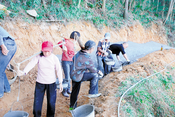 盘谷乡洋里村上洋11号滑坡简易降险点,工人们正在修建截水沟。 ■ 郑与国 齐培松