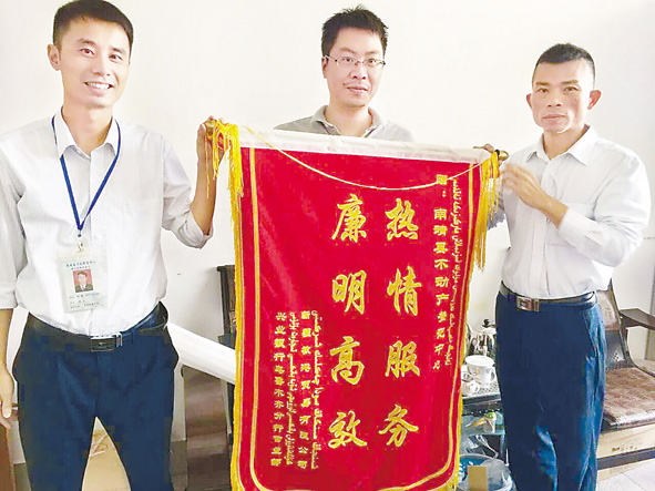 日前,新疆闽港贸易有限公司在办理不动产担保抵押登记手续时,因时间紧,提供的材料不齐,南靖县不动产登记中心加班加点为其进行容缺受理,及时解决企业融资难题。图为11月7日,该公司给不动产登记中心赠送锦旗。■ 王忠华 刘 毅