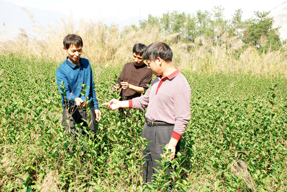 泉州市国土资源部门积极引导社会力量参与废弃矿山生态环境恢复治理,仅安溪县就引导茶农利用关闭的采石场开垦出1000多亩茶园。图为12月8日,安溪县地质矿产股干部苏吾成和官桥国土资源所干部林海腾在官桥镇仁峰村18组村民林江华(左)的茶园里,现场了解开垦废弃采石场种植茶叶的情况。 ■ 齐培松 涂晓扬