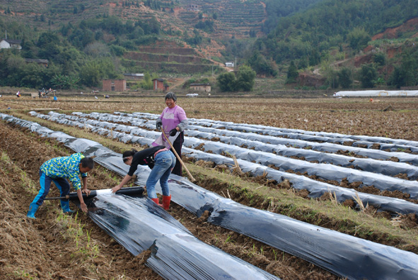 图为当地村民黄大娘和孙子孙女在田间铺设防冻薄膜。■ 特约记者 吕洪荣 通讯员 吴美娟