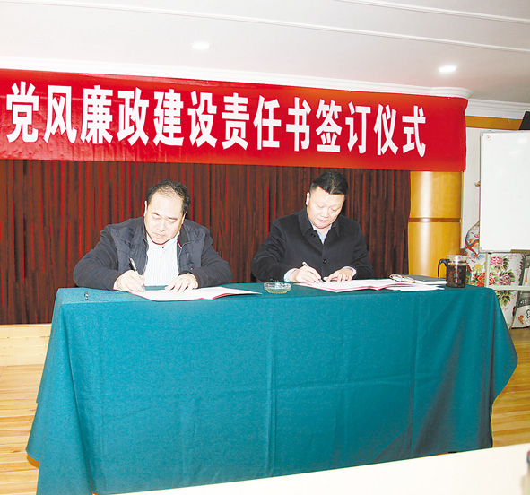 日前,省移民开发局举行党风廉政建设责任书签订仪式,该局党组书记、局长蔡伟与领导班子成员,领导班子成员与分管处室和工程移民职业技术学校负责人分别签订了党风廉政建设责任书。图为蔡伟局长(右)与杨昌健副局长在签订责任书。■ 赵 承