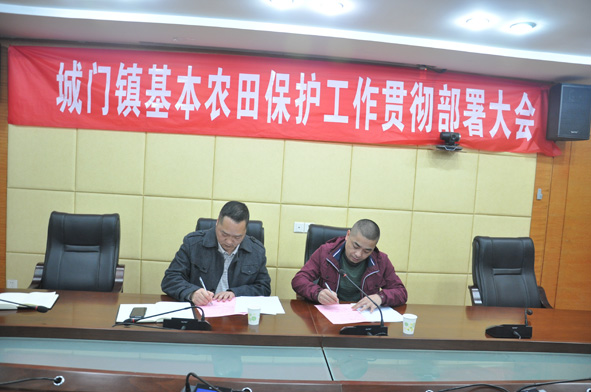 福州市仓山区继去年底落实1858.01亩永久基本农田后,目前正按照“落地块、明责任、设标志、建表册、入图库”工作要求,有序推进相关后续工作。图为3月6日,城门镇镇长翁强(左)与村干部签订基本农田保护责任书。■ 郑与国 顾庆国
