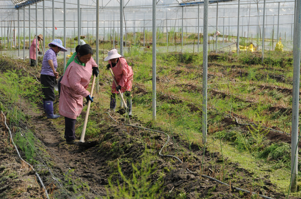 图为日前,上杭县临城镇九洲村村民在浩宇农业发展有限公司的蔬菜大棚里整畦培土。