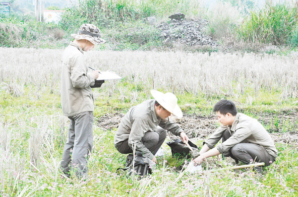日前,省第八地质大队承接的长汀县农业地质调查评价项目已完成调查县域连片耕地约200平方公里,采集表层土壤样品共2522件,平均采样密度12.5点/平方公里。图为该队技术人员在农田里采集土壤样本。