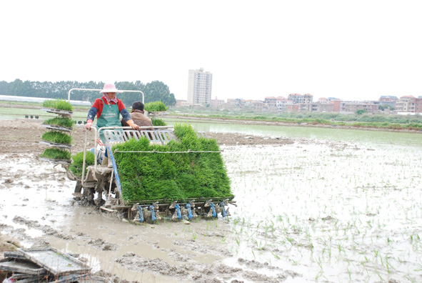 4月13日,在晋江市磁灶镇永久基本农田保护区,六七个村民正在水田中撒肥料,三四个村民在旁边的秧田里拔秧苗,一部播秧机正在前面不远处的水田里来回均匀地插秧。站在路边的磁灶镇洋宅村村民李锦成告诉记者:“这里的水田都是经过整理的,修了田间路和水渠,方便了耕作。我在附近一共承包了700多亩田地,那十多位村民都是我雇来帮忙春耕的。” ■ 本报记者 齐培松