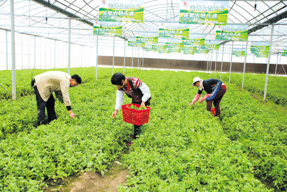 福建力豪现代农业有限公司通过土地流转,承包了晋江市内坑镇砌坑村1200多亩耕地,并实施土地整理,建设农业示范园,发展绿色农业。截至今年4月底,该公司已建好250亩智能温控大棚,主要种植西红柿、秋葵、黄瓜等30多种生态蔬菜。图为该公司员工正在智能温控大棚里采摘生态蔬菜——冰草。