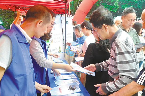5月8日,省减灾委联合福州市减灾委在福州温泉公园北广场举行2017年福建省5·12“防灾减灾日”宣传周启动仪式,并在现场开展防灾减灾技能展示和咨询活动。图为在活动现场,省国土资源厅和福州市国土资源局工作人员向群众分发防灾减灾宣传材料,并耐心解释群众提出的相关问题。据了解,现场共分发《地质灾害防治条例》《地质灾害科普宣传》《地图管理条例》等宣传材料1000多份。