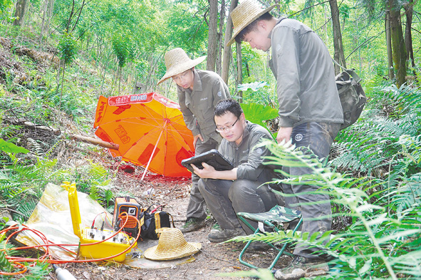 近日,省第八地质大队利用地质专业优势,承接了龙岩洞文化公园前期地质工作。该项目规划用地面积74公顷。图为该队技术人员正利用物探仪器查找该规划区内溶洞赋存情况。■
