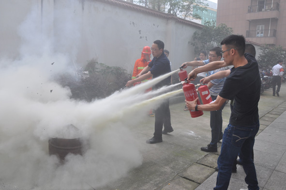 图为参加演练人员正在演练灭火器使用方法。■ 本报记者 郑志鑫