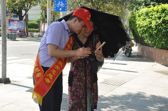 图为志愿者为群众指引路线。 ■ 郑与国