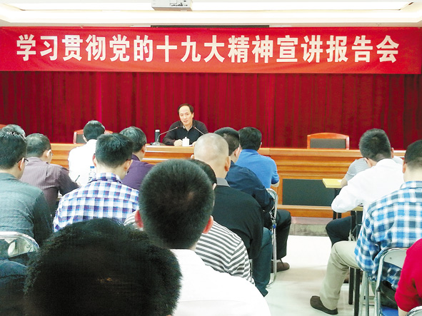 省地质矿产勘查开发局成立了由局党组成员、副巡视员组成的宣讲组,分赴局属单位宣讲党的十九大精神。图为该局党组书记、局长邵旭于11月17日深入所属省地质测绘院宣讲党的十九大精神。 ■ 特约记者 张瑞利