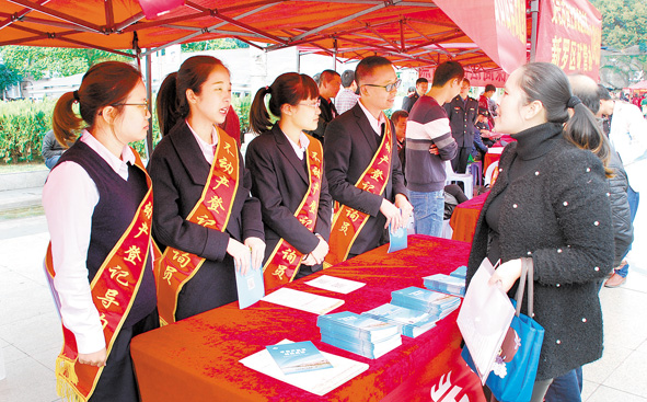 上图为龙岩市国土资源局在市街心公园组织开展法制宣传日活动,向过往群众宣传国土资源法律法规和不动产登记有关知识。 ■ 吕洪荣