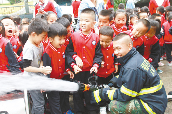 省121地质大队幼儿园日前开展以“时时注意安全,处处预防火灾”为主题的第26个“119消防日”活动,提高全园师生应对火灾危险的应急处理能力。图为龙岩消防支队官兵向孩子们示范消防器械的使用。■ 郭琳琳 王文琴
