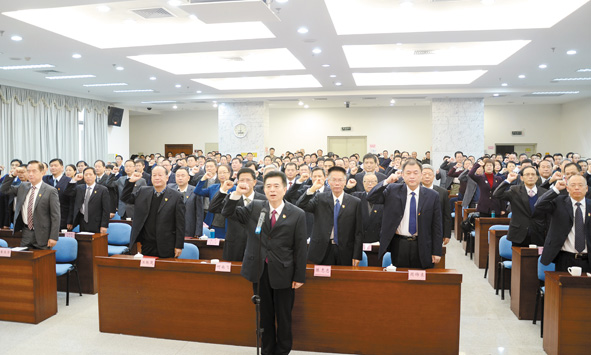 图为省国土资源厅党组书记董建洲带领全体党员干部集体重温入党誓词。■ 郑志鑫