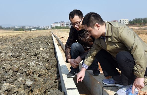 图为专家组成员现场查看土地整理项目区内新修建的灌排渠等基础设施建设情况。■ 林 昇 魏中伟