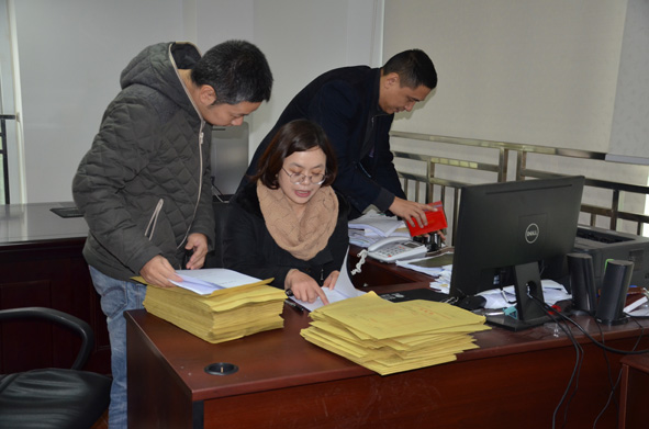 图为今年元旦前夕,福清市国土资源局工作人员正在认真抽查作业单位提交的音西街道云中村地籍与房屋调查表、不动产权籍调查表,确保调查成果质量。 ■ 齐培松 齐 政