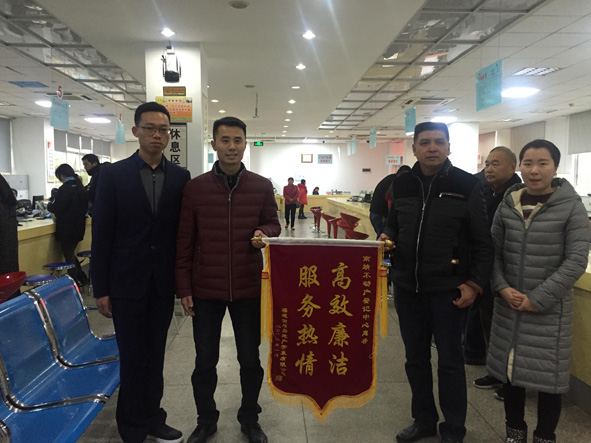 近日,福建润朋房地产开发有限公司负责人将一面印有“高效廉洁 服务热情”的锦旗送到南靖县不动产登记中心窗口,对该中心在为其办理商品房转移登记及抵押登记时提供的优质、便捷服务表示感谢。